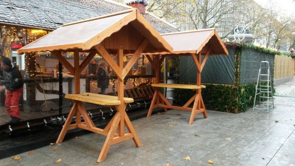 Die biergartenganitur ist auch ohne dach mit umklappbaren bänken modell christian ii oder feststehenden bänken modell christian i lieferbar.